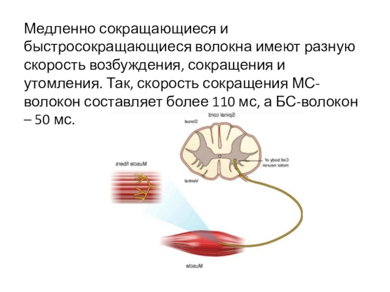 Слайд 13Медленно сокращающиеся и быстросокращающиеся волокна имеют разную скорость возбуждения, сокращения и