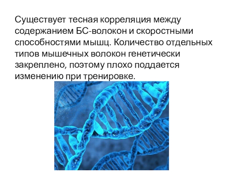 Слайд 15Существует тесная корреляция между содержанием БС-волокон и скоростными способностями мышц. Количество