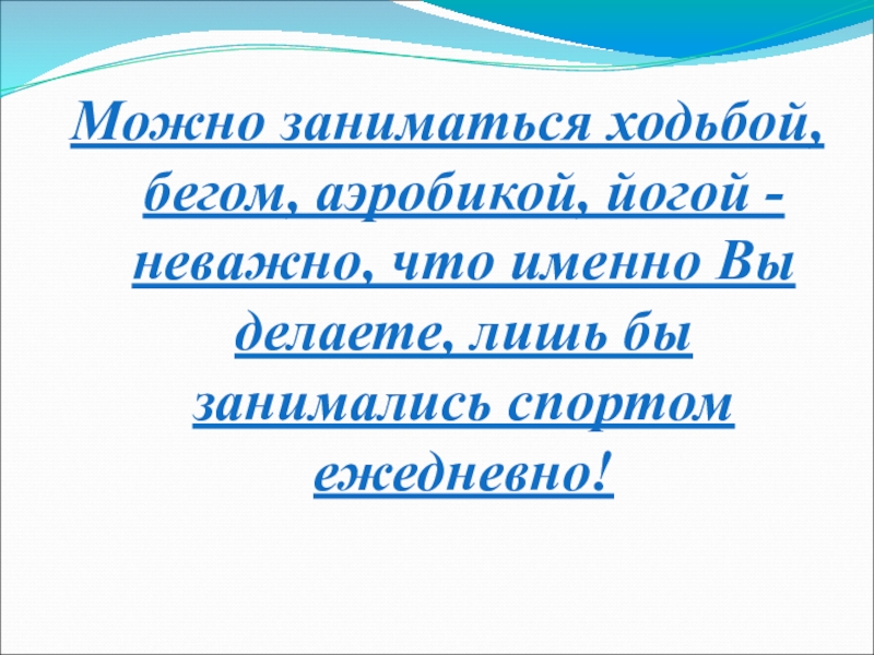 Слайд 14Можно заниматься ходьбой, бегом, аэробикой, йогой - неважно, что именно Вы