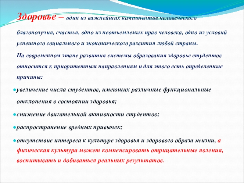 На современном этапе развития системы образования здоровье студентов относится к приоритетным направлениям и для этого есть определенные причины: