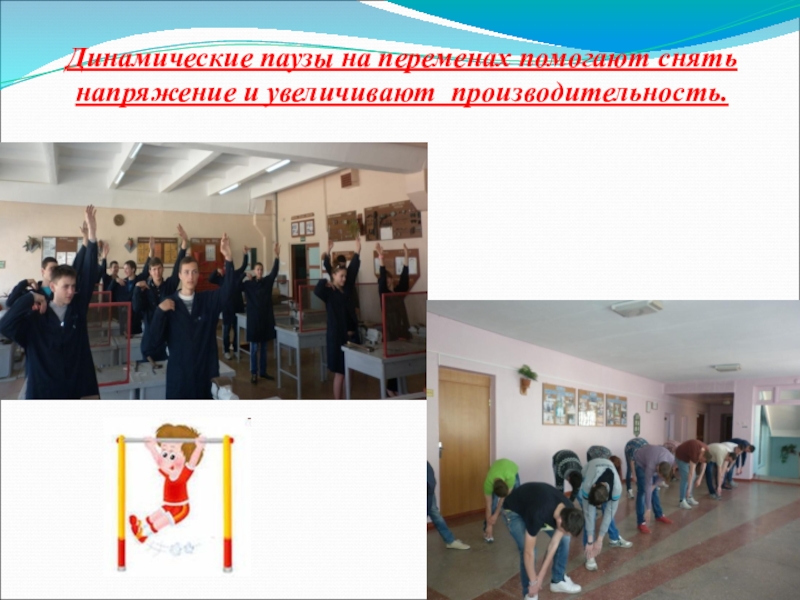 Слайд 11Динамические паузы на переменах помогают снять напряжение и увеличивают производительность.