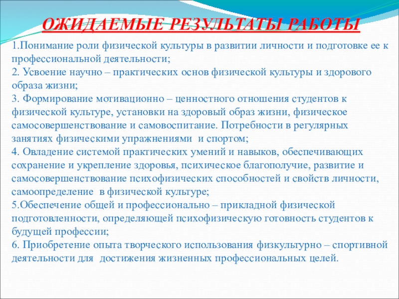 6. Приобретение опыта творческого использования физкультурно – спортивной деятельности для достижения жизненных профессиональных целей.