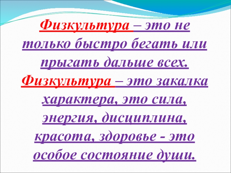 Физкультура – это закалка характера, это сила, энергия, дисциплина, красота, здоровье - это особое состояние души.