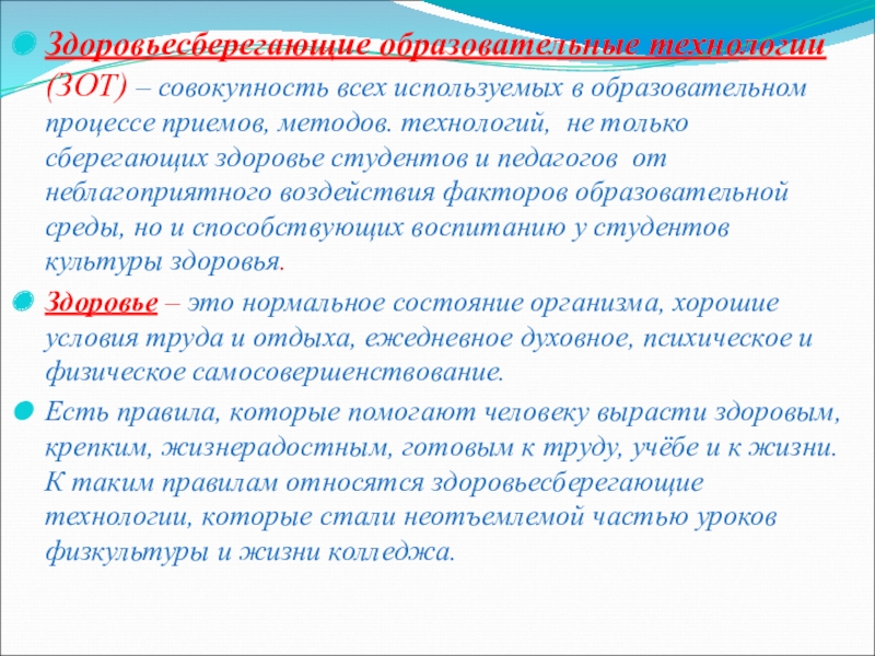 Слайд 9Здоровьесберегающие образовательные технологии (ЗОТ) – совокупность всех используемых в образовательном процессе