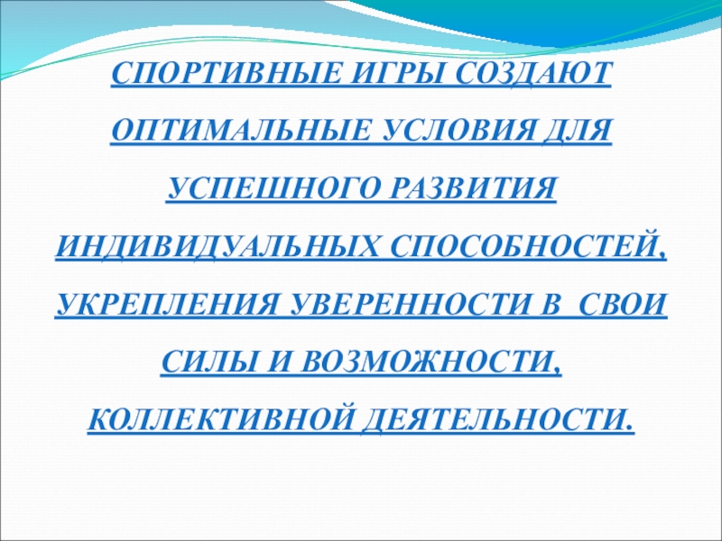 Слайд 21СПОРТИВНЫЕ ИГРЫ СОЗДАЮТ ОПТИМАЛЬНЫЕ УСЛОВИЯ ДЛЯ УСПЕШНОГО РАЗВИТИЯ ИНДИВИДУАЛЬНЫХ СПОСОБНОСТЕЙ, УКРЕПЛЕНИЯ