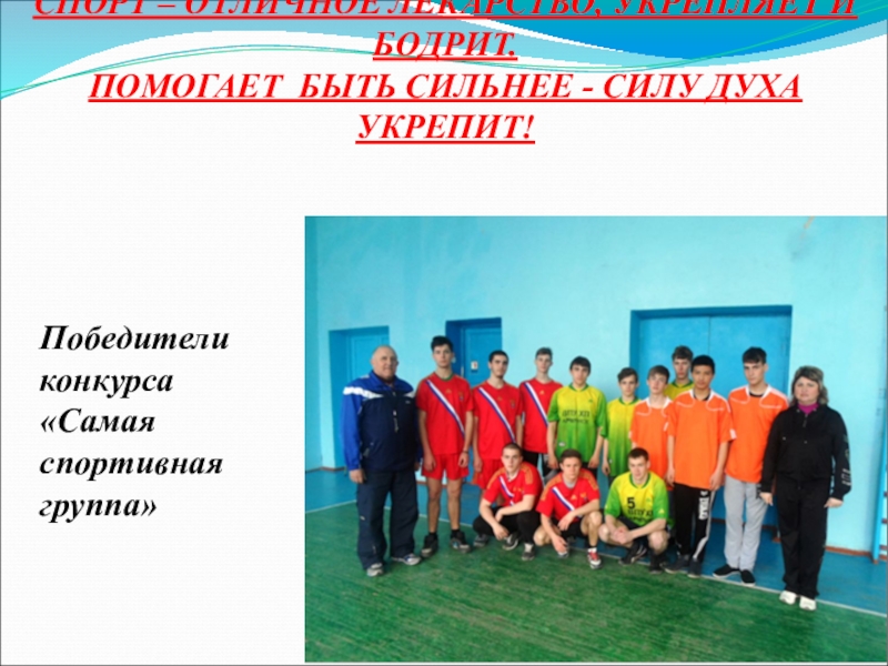 Слайд 25СПОРТ – ОТЛИЧНОЕ ЛЕКАРСТВО, УКРЕПЛЯЕТ И БОДРИТ.