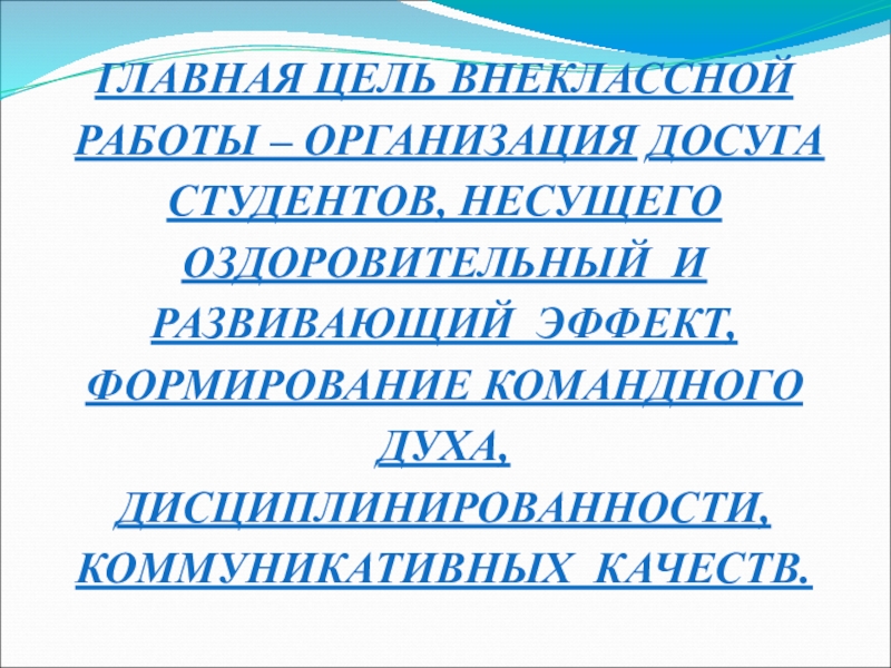 Слайд 27ГЛАВНАЯ ЦЕЛЬ ВНЕКЛАССНОЙ РАБОТЫ – ОРГАНИЗАЦИЯ ДОСУГА СТУДЕНТОВ, НЕСУЩЕГО ОЗДОРОВИТЕЛЬНЫЙ И