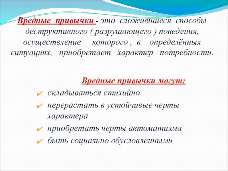 Слайд 34Вредные привычки - это сложившиеся способы деструктивного ( разрушающего ) поведения,