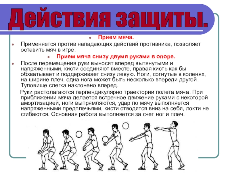 Прием мяча. Применяется против нападающих действий противника, позволяет оставить мяч в игре.Прием мяча снизу двумя руками в