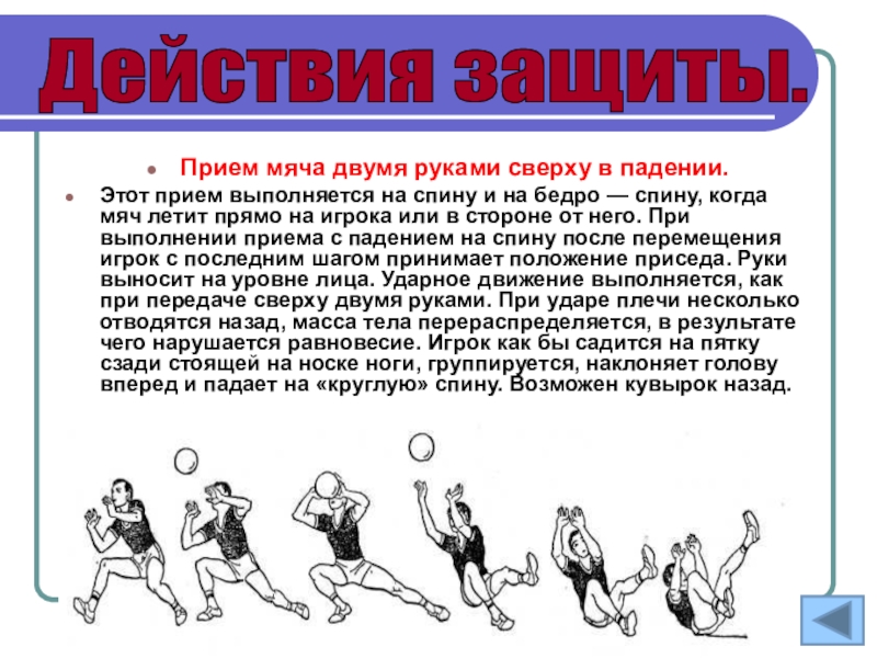Прием мяча двумя руками сверху в падении. Этот прием выполняется на спину и на бедро — спину,