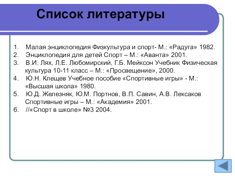 Список литературы1.  Малая энциклопедия Физкультура и спорт- М.: «Радуга» 1982.2.  Энциклопедия для детей Спорт –