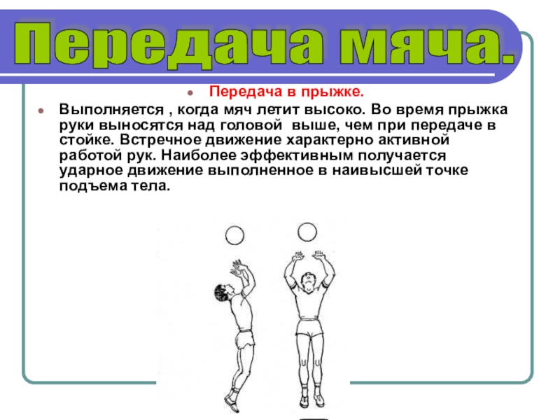Передача в прыжке. Выполняется , когда мяч летит высоко. Во время прыжка руки выносятся над головой выше,