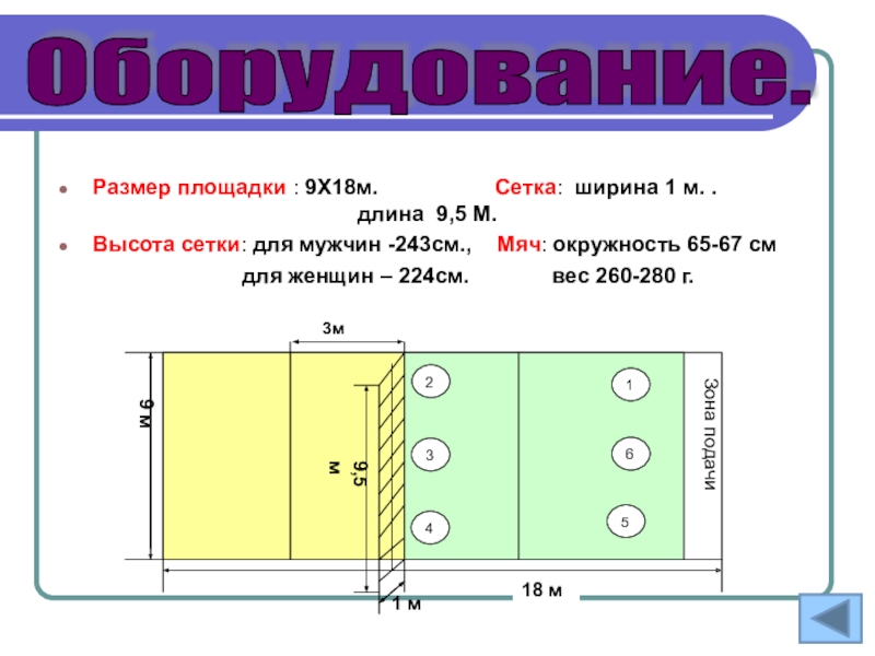 Высота сетки: для мужчин -243см., Мяч: окружность 65-67 см