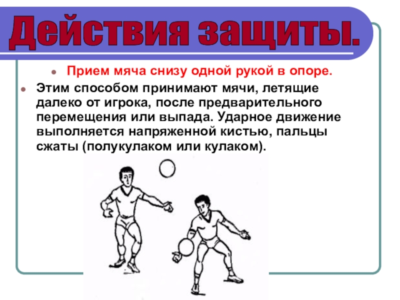 Прием мяча снизу одной рукой в опоре. Этим способом принимают мячи, летящие далеко от игрока, после предварительного