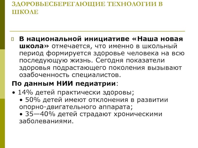 В документе отмечено… «Именно в школьный период формируется здоровье человека на всю последующую жизнь. Многое здесь зависит от семейного воспитания, но учитывая, что дети проводят в школе значительную часть дня, заниматься их здоровьем должны, в том числе и педагоги.»
