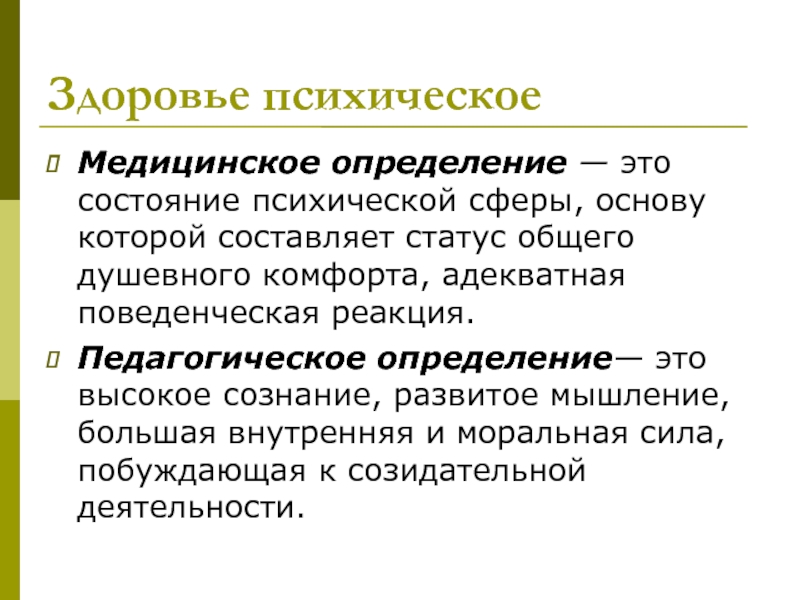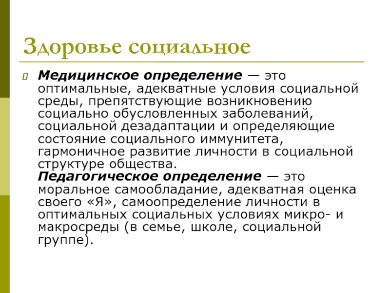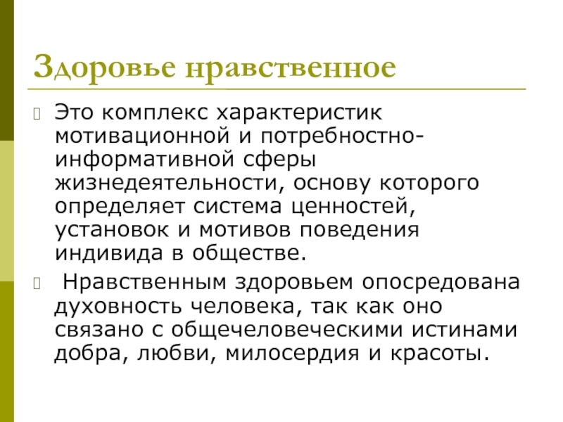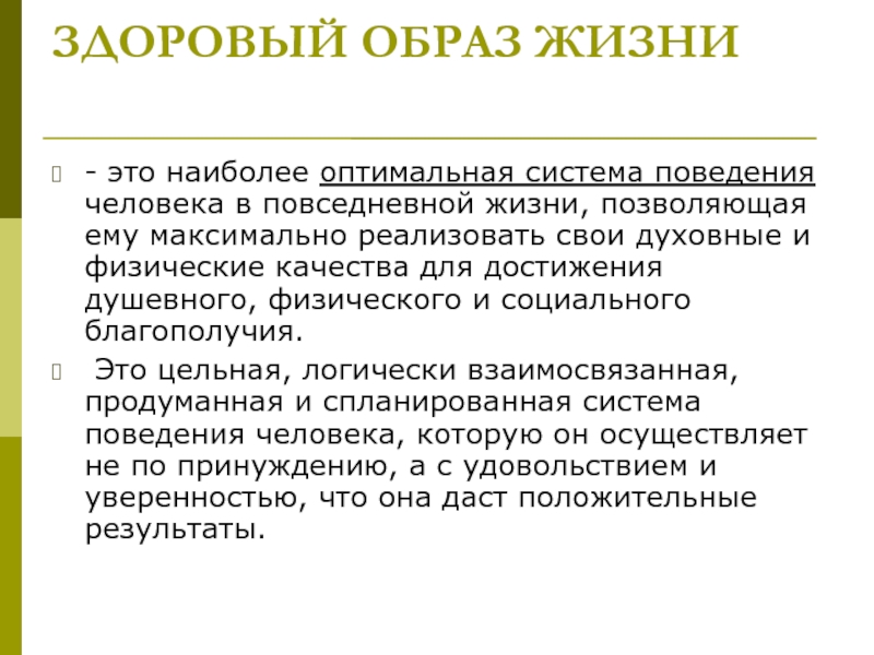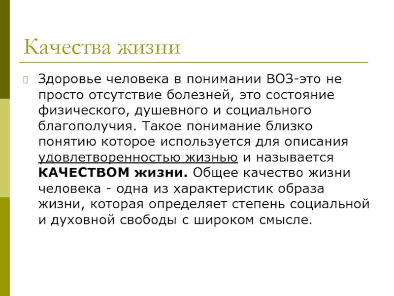 состояние физического, душевного и социального благополучия. Такое понимание близко понятию которое используется для описания удовлетворенностью жизнью и называется КАЧЕСТВОМ жизни. Общее качество жизни человека - одна из характеристик образа жизни, которая определяет степень социальной и духовной свободы с широком смысле.