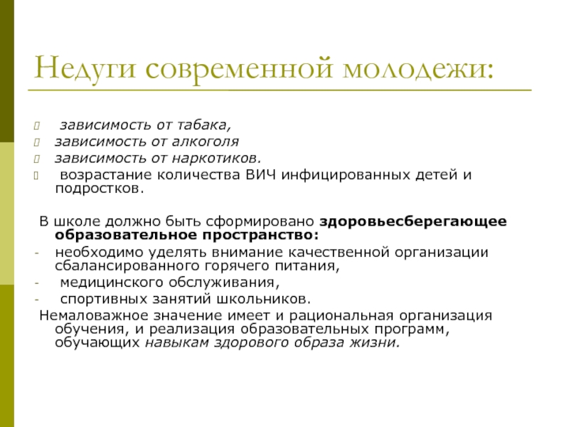 Во-вторых, школа в явно недостаточной степени решает свою образовательную задачу в этой сфере: знания, умения и навыки подростков по вопросам здоровья, их мотивация на ведение здорового образа жизни находятся на низком уровне, что является одной из предпосылок неблагополучия.