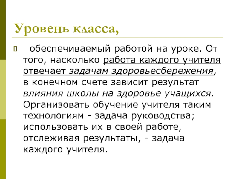 учителя отвечает задачам здоровьесбережения, в конечном счете зависит результат влияния школы на здоровье учащихся. Организовать обучение учителя таким технологиям - задача руководства; использовать их в своей работе, отслеживая результаты, - задача каждого учителя.