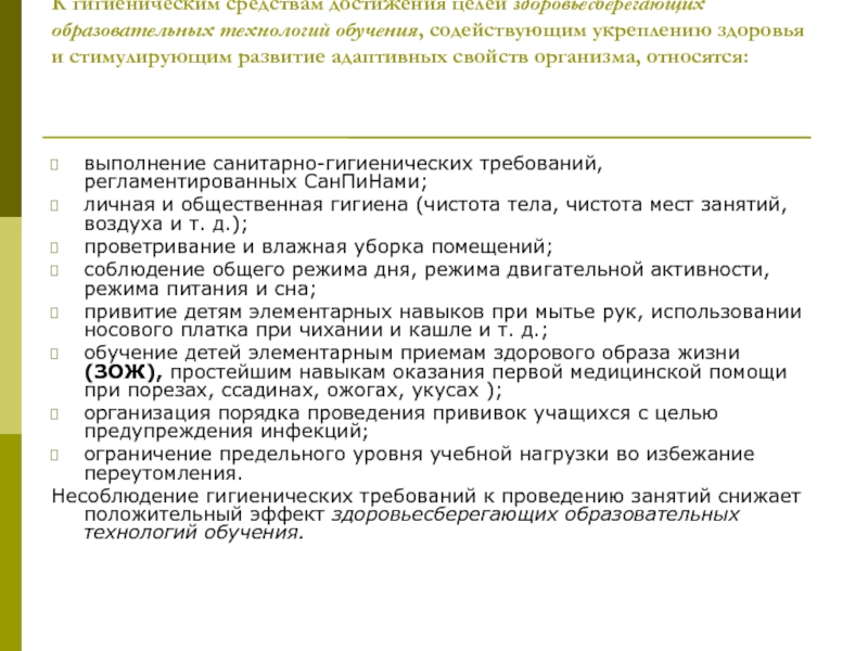 Несоблюдение гигиенических требований к проведению занятий снижает положительный эффект здоровьесберегающих образовательных технологий обучения.