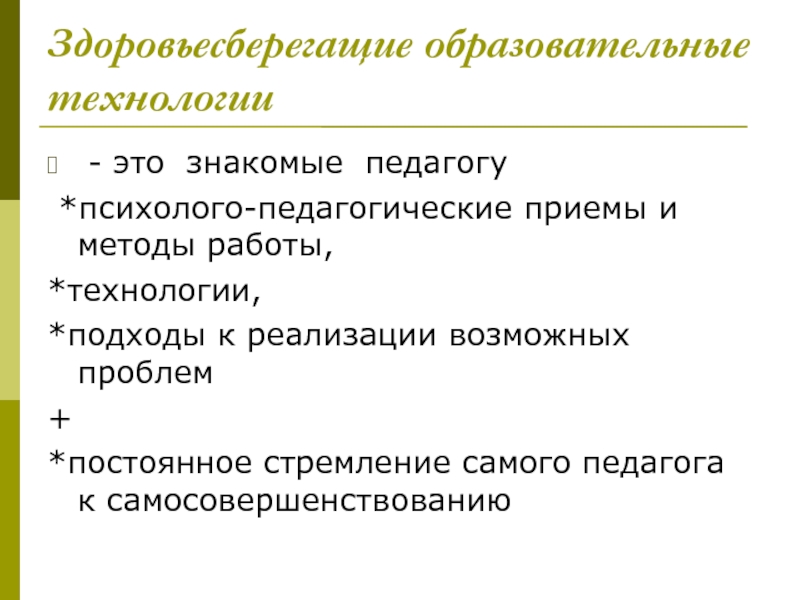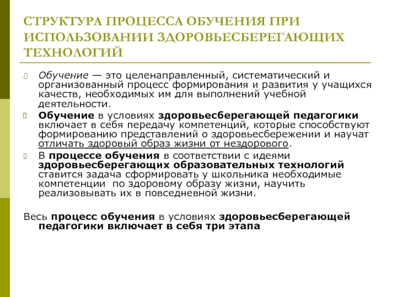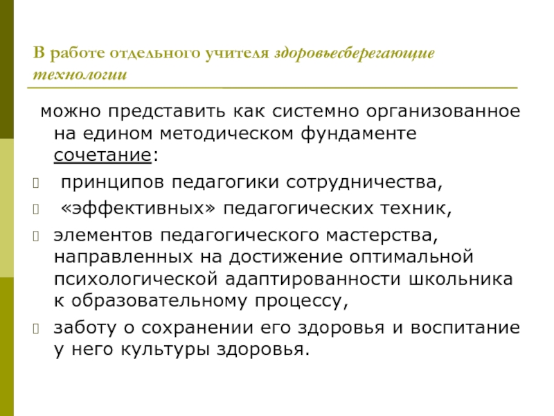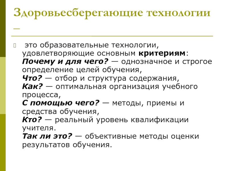 образовательной технологии, её «сертификат безопасности для здоровья», и как совокупность тех принципов, приёмов, методов педагогической работы, которые дополняя традиционные технологии обучения и воспитания, наделяют их признаком здоровьесбережения.
