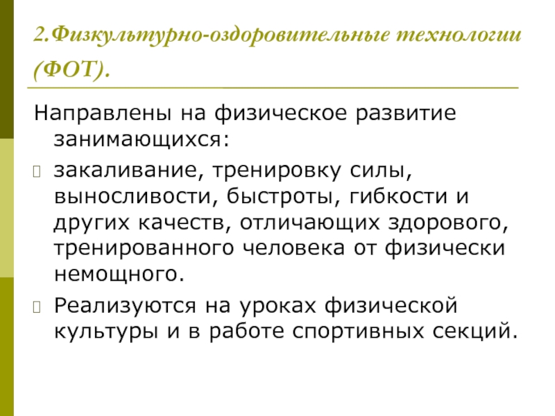 Слайд 132.Физкультурно-оздоровительные технологии (ФОТ).