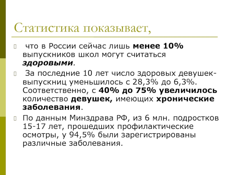 За последние 10 лет число здоровых девушек-выпускниц уменьшилось с 28,3% до 6,3%. Соответственно, с 40% до 75% увеличилось количество девушек, имеющих хронические заболевания.