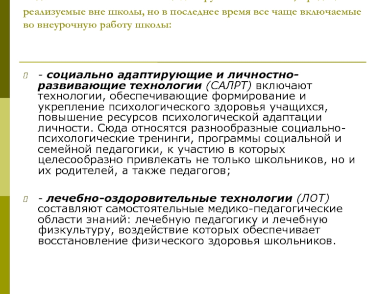 - социально адаптирующие и личностно-развивающие технологии (САЛРТ) включают технологии, обеспечивающие формирование и укрепление психологического здоровья учащихся, повышение ресурсов психологической адаптации личности. Сюда относятся разнообразные социально-психологические тренинги, программы социальной и семейной педагогики, к участию в которых целесообразно привлекать не только школьников, но и их родителей, а также педагогов;