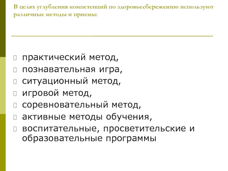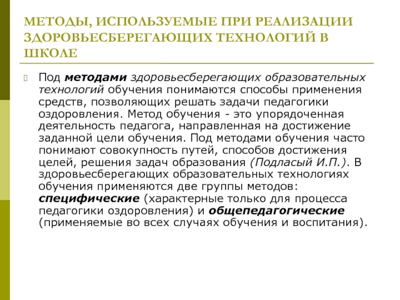 обучения понимаются способы применения средств, позволяющих решать задачи педагогики оздоровления. Метод обучения - это упорядоченная деятельность педагога, направленная на достижение заданной цели обучения. Под методами обучения часто понимают совокупность путей, способов достижения целей, решения задач образования (Подласый И.П.). В здоровьесберегающих образовательных технологиях обучения применяются две группы методов: специфические (характерные только для процесса педагогики оздоровления) и общепедагогические (применяемые во всех случаях обучения и воспитания).
