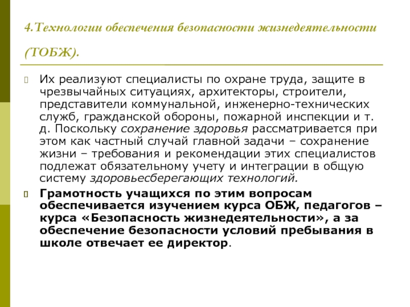 защите в чрезвычайных ситуациях, архитекторы, строители, представители коммунальной, инженерно-технических служб, гражданской обороны, пожарной инспекции и т.д. Поскольку сохранение здоровья рассматривается при этом как частный случай главной задачи – сохранение жизни – требования и рекомендации этих специалистов подлежат обязательному учету и интеграции в общую систему здоровьесберегающих технологий.