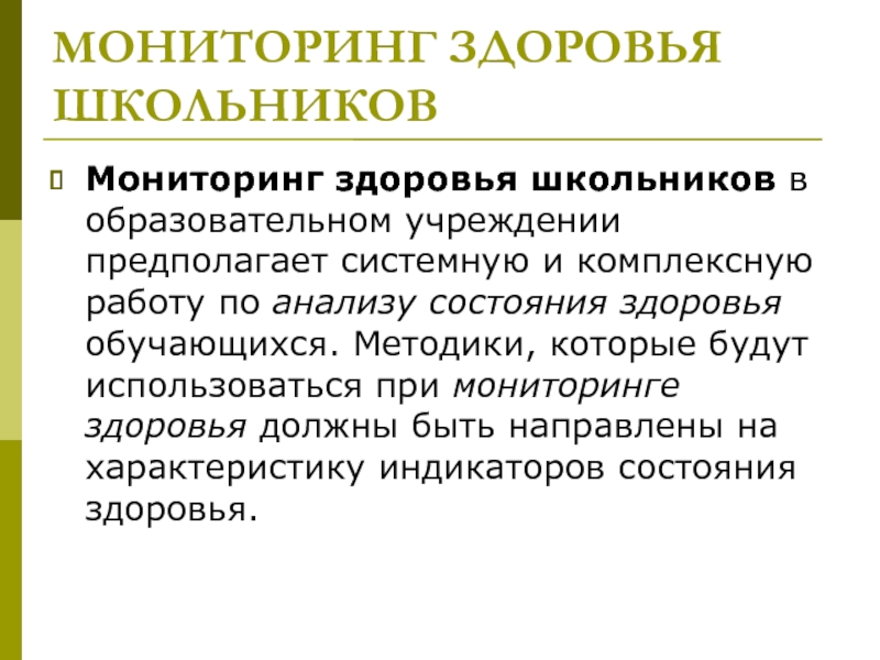 комплексную работу по анализу состояния здоровья обучающихся. Методики, которые будут использоваться при мониторинге здоровья должны быть направлены на характеристику индикаторов состояния здоровья.