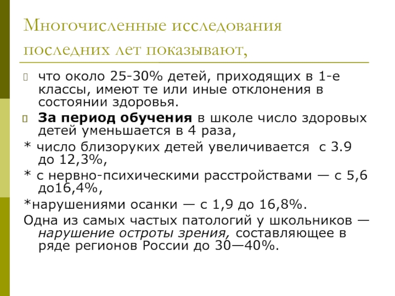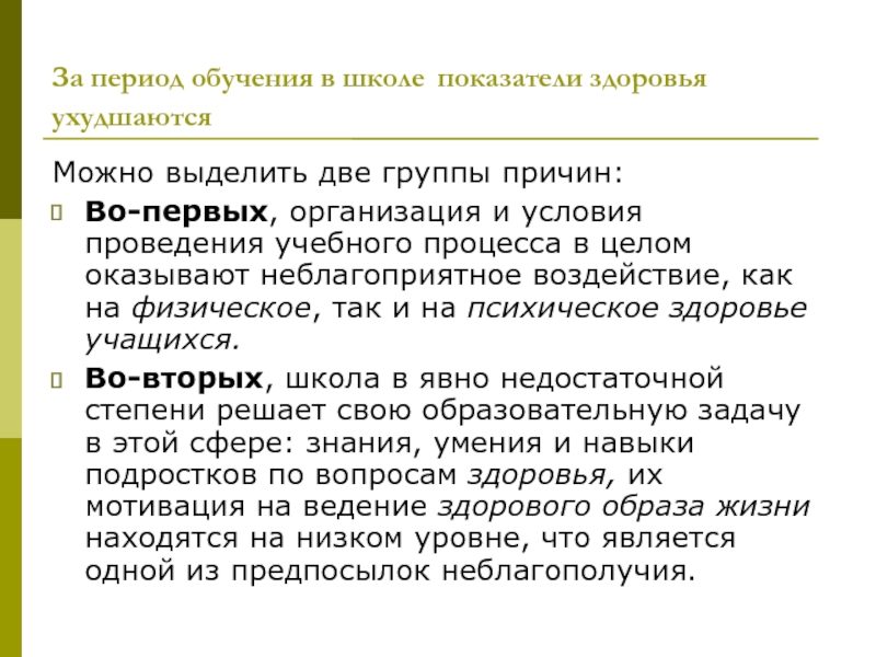 Во-первых, организация и условия проведения учебного процесса в целом оказывают неблагоприятное воздействие, как на физическое, так и на психическое здоровье учащихся.