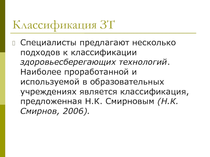Специалисты предлагают несколько подходов к классификации здоровьесберегающих технологий. Наиболее проработанной