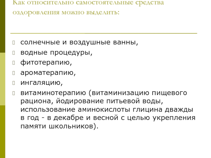 Слайд 45Как относительно самостоятельные средства оздоровления можно выделить: