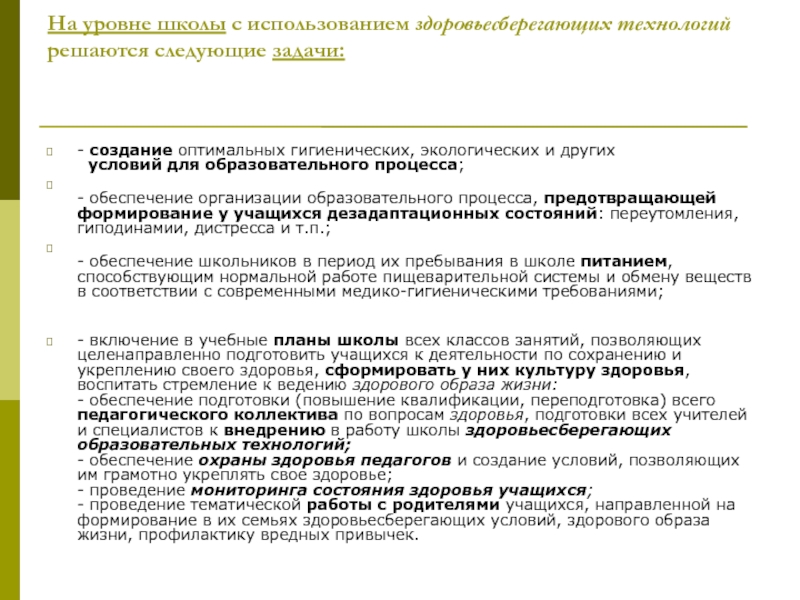 Слайд 18На уровне школы с использованием здоровьесберегающих технологий решаются следующие задачи: