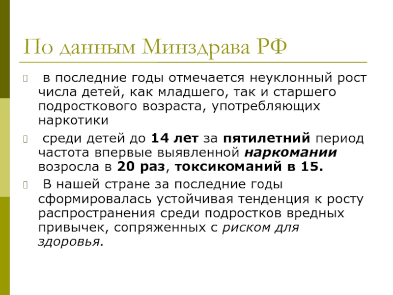 В нашей стране за последние годы сформировалась устойчивая тенденция к росту распространения среди подростков вредных привычек, сопряженных с риском для здоровья.