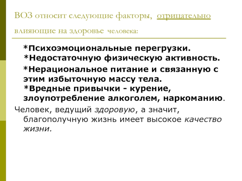 Слайд 53ВОЗ относит следующие факторы, отрицательно влияющие на здоровье человека:
