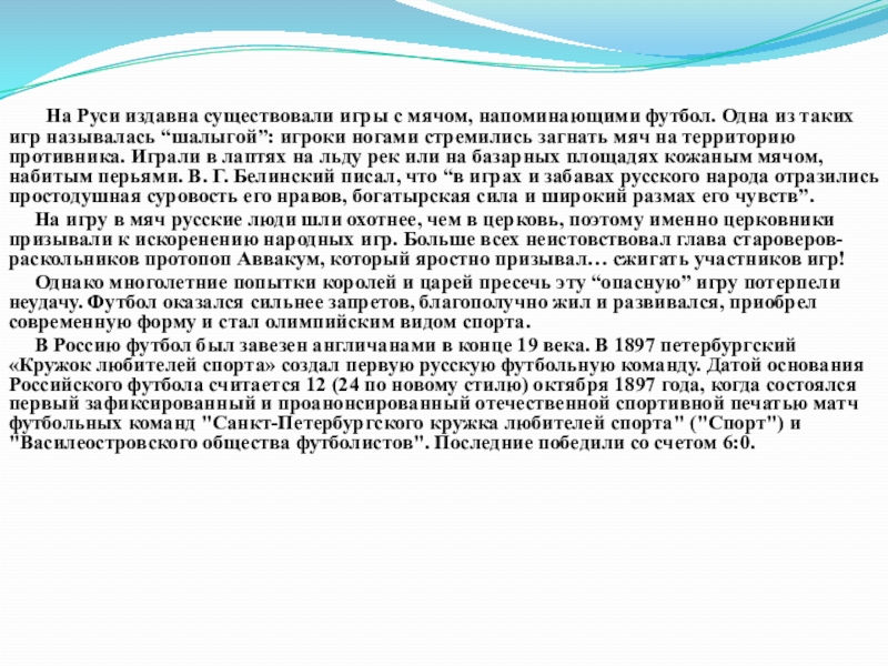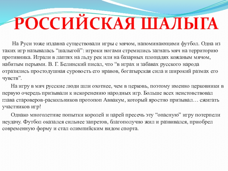 мячом, напоминающими футбол. Одна из таких игр называлась “шалыгой”: игроки ногами стремились загнать мяч на территорию противника. Играли в лаптях на льду рек или на базарных площадях кожаным мячом, набитым перьями. В. Г. Белинский писал, что “в играх и забавах русского народа отразились простодушная суровость его нравов, богатырская сила и широкий размах его чувств”.
