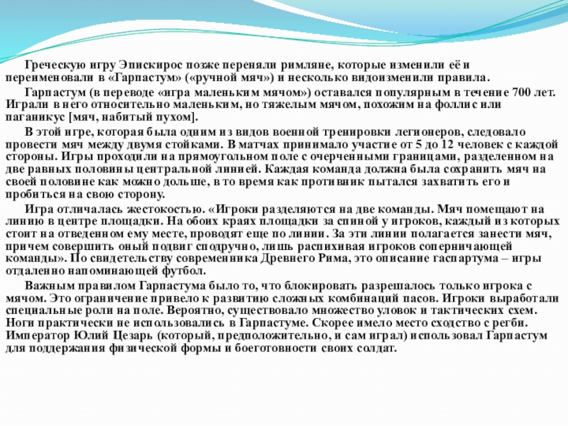 Игра отличалась жестокостью. «Игроки разделяются на две команды. Мяч помещают на линию в центре площадки. На обоих краях площадки за спиной у игроков, каждый из которых стоит на отведенном ему месте, проводят еще по линии. За эти линии полагается занести мяч, причем совершить оный подвиг сподручно, лишь распихивая игроков соперничающей команды». По свидетельству современника Древнего Рима, это описание гаспартума – игры отдаленно напоминающей футбол.