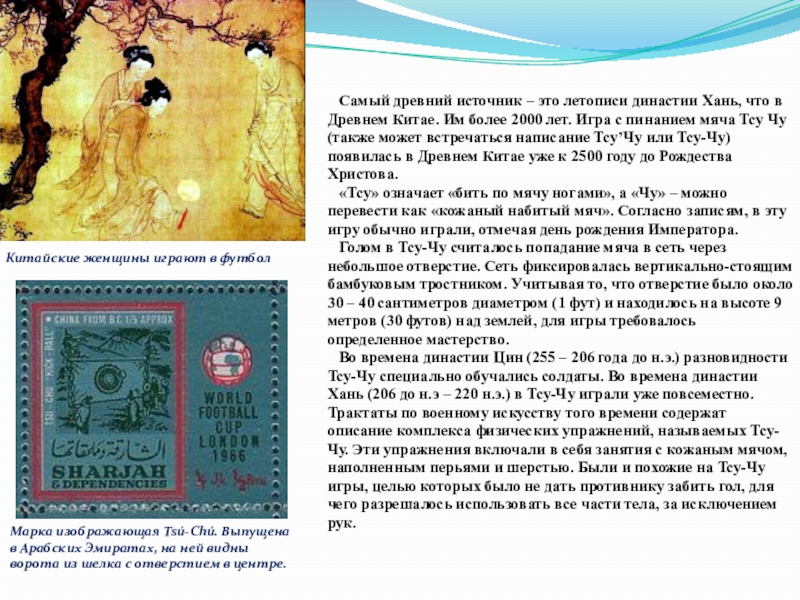 в Древнем Китае. Им более 2000 лет. Игра с пинанием мяча Тсу Чу (также может встречаться написание Тсу’Чу или Тсу-Чу) появилась в Древнем Китае уже к 2500 году до Рождества Христова.