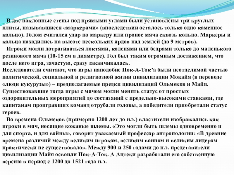 Во времена Ольмеков (примерно 1200 лет до н.э.) властители изображались как игроки в мяч, носящие кожаные шлемы. «Это могли быть шлемы одновременно и для спорта, и для войны», говорит уважаемый профессор антропологии: «В древние времена различий между великим игроком, великим воином и великим лидером практически не существовало». Между 900 и 250 годами до н.э. представители цивилизации Майя освоили Пок-А-Ток. А Ацтеки разработали его собственную версию в период с 1200 до 1521 года н.э.