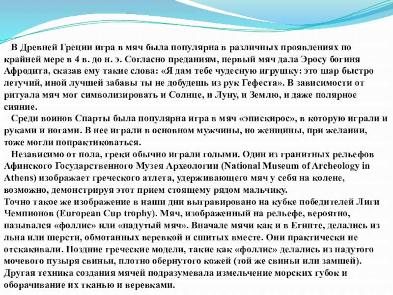 в различных проявлениях по крайней мере в 4 в. до н. э. Согласно преданиям, первый мяч дала Эросу богиня Афродита, сказав ему такие слова: «Я дам тебе чудесную игрушку: это шар быстро летучий, иной лучшей забавы ты не добудешь из рук Гефеста». В зависимости от ритуала мяч мог символизировать и Солнце, и Луну, и Землю, и даже полярное сияние.