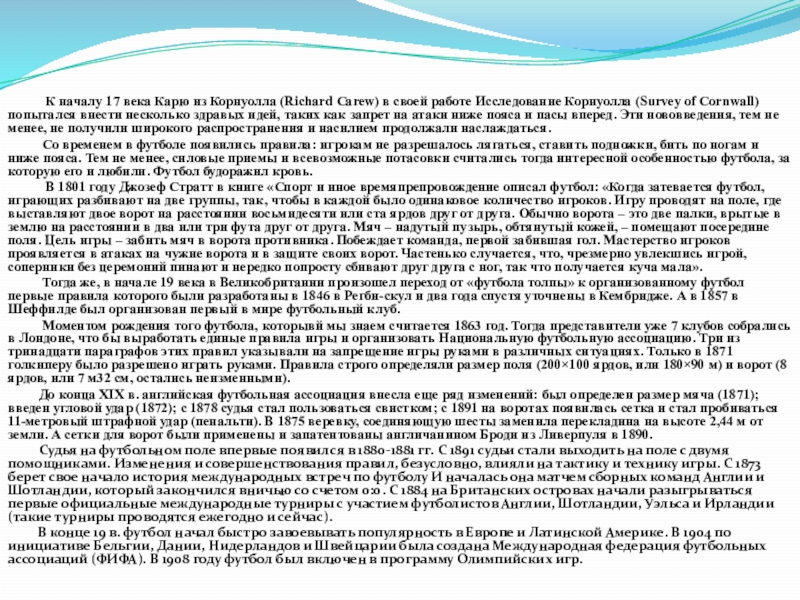 В 1801 году Джозеф Стратт в книге «Спорт и иное времяпрепровождение описал футбол: «Когда затевается футбол, играющих разбивают на две группы, так, чтобы в каждой было одинаковое количество игроков. Игру проводят на поле, где выставляют двое ворот на расстоянии восьмидесяти или ста ярдов друг от друга. Обычно ворота – это две палки, врытые в землю на расстоянии в два или три фута друг от друга. Мяч – надутый пузырь, обтянутый кожей, – помещают посередине поля. Цель игры – забить мяч в ворота противника. Побеждает команда, первой забившая гол. Мастерство игроков проявляется в атаках на чужие ворота и в защите своих ворот. Частенько случается, что, чрезмерно увлекшись игрой, соперники без церемоний пинают и нередко попросту сбивают друг друга с ног, так что получается куча мала».