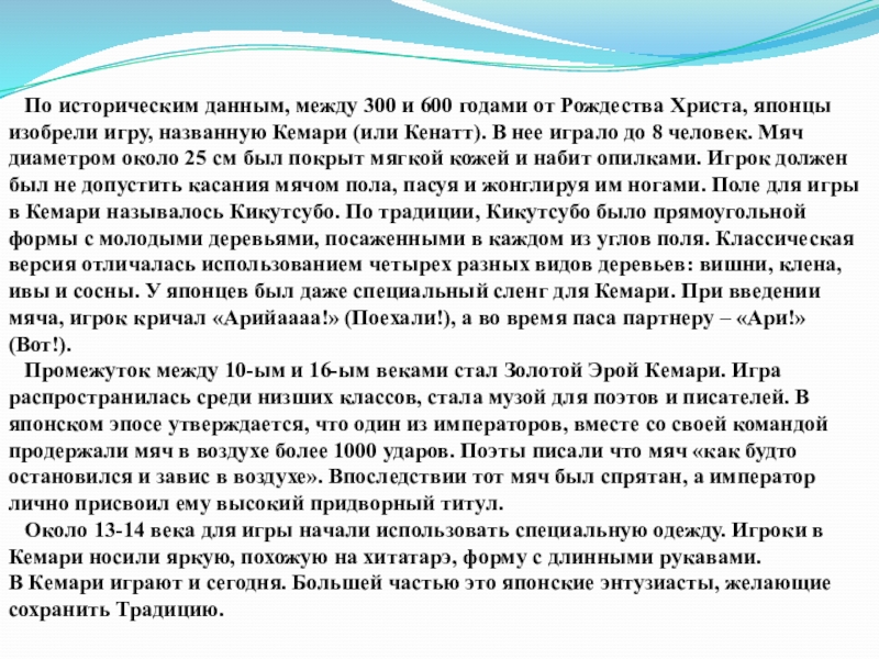Рождества Христа, японцы изобрели игру, названную Кемари (или Кенатт). В нее играло до 8 человек. Мяч диаметром около 25 см был покрыт мягкой кожей и набит опилками. Игрок должен был не допустить касания мячом пола, пасуя и жонглируя им ногами. Поле для игры в Кемари называлось Кикутсубо. По традиции, Кикутсубо было прямоугольной формы с молодыми деревьями, посаженными в каждом из углов поля. Классическая версия отличалась использованием четырех разных видов деревьев: вишни, клена, ивы и сосны. У японцев был даже специальный сленг для Кемари. При введении мяча, игрок кричал «Арийаааа!» (Поехали!), а во время паса партнеру – «Ари!» (Вот!).