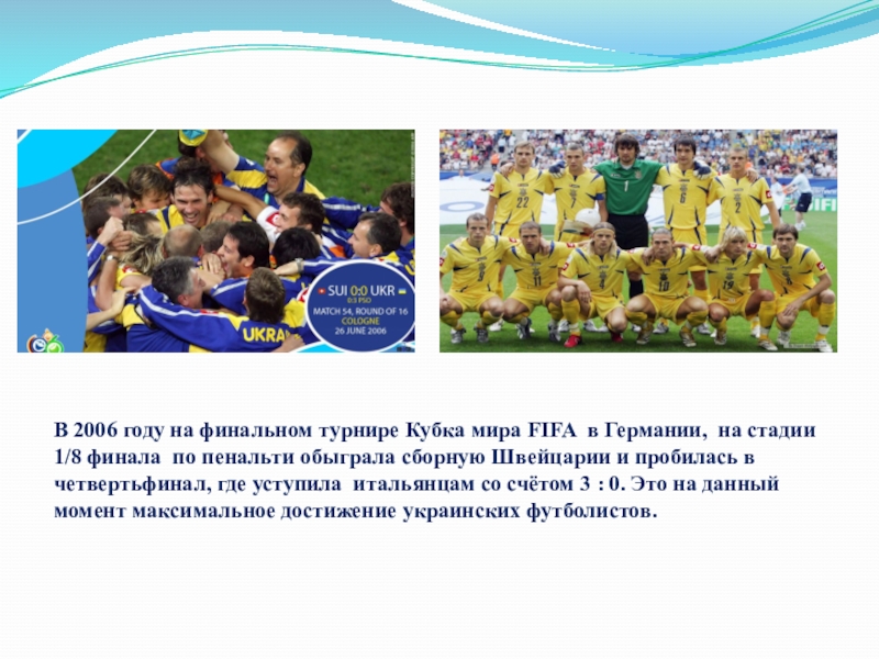 1/8 финала по пенальти обыграла сборную Швейцарии и пробилась в четвертьфинал, где уступила итальянцам со счётом 3 : 0. Это на данный момент максимальное достижение украинских футболистов.