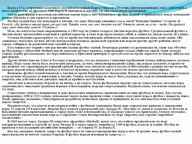 Футбол толпой был так популярен в Англии, что даже Шекспир упоминает его в своей “Комедии Ошибок” (Comedy of Errors): «Да будто я такой дурак уж круглый, Чтобы меня, как мяч, пинать ногой? Оттуда гонит он, а вы – туда; По крайней мере хоть обшейте кожей! (Уходит.)»