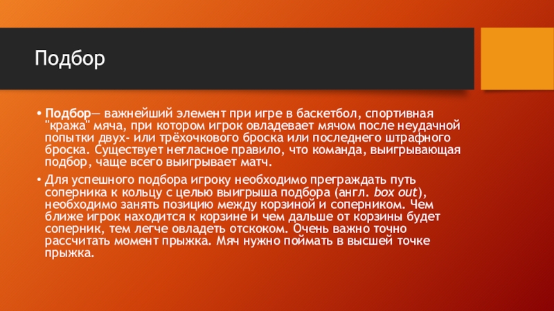 Подбор— важнейший элемент при игре в баскетбол, спортивная "кража" мяча, при