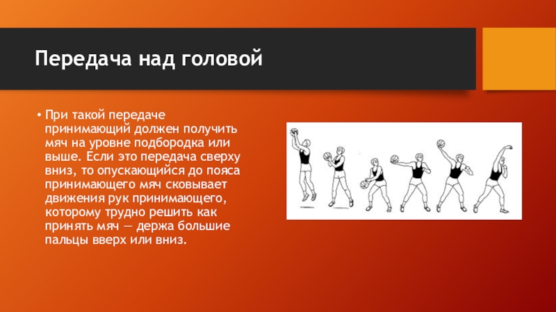 подбородка или выше. Если это передача сверху вниз, то опускающийся до пояса принимающего мяч сковывает движения рук принимающего, которому трудно решить как принять мяч — держа большие пальцы вверх или вниз.