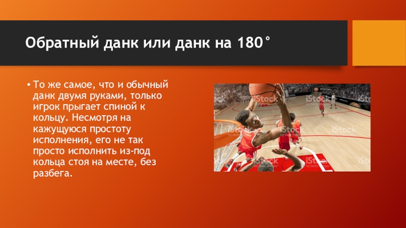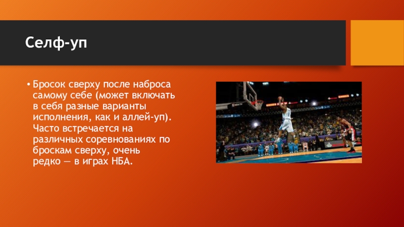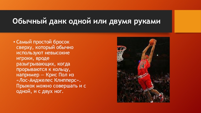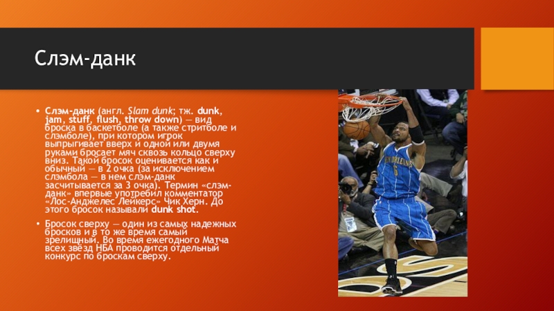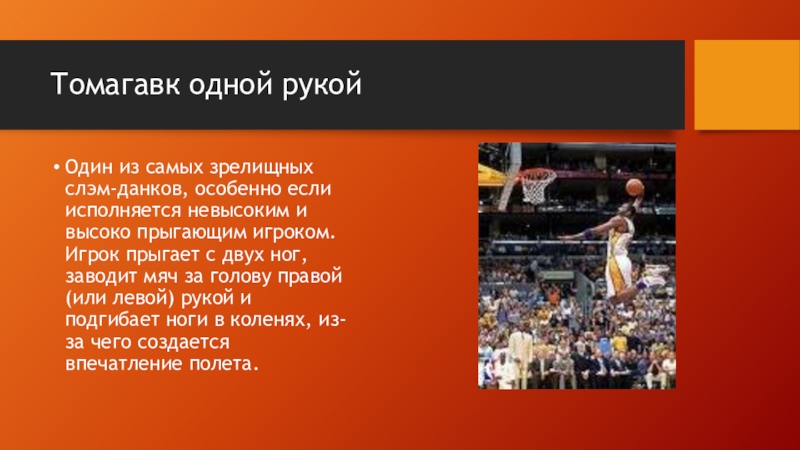 и высоко прыгающим игроком. Игрок прыгает с двух ног, заводит мяч за голову правой (или левой) рукой и подгибает ноги в коленях, из-за чего создается впечатление полета.