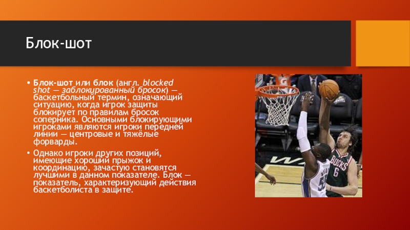 Однако игроки других позиций, имеющие хороший прыжок и координацию, зачастую становятся лучшими в данном показателе. Блок — показатель, характеризующий действия баскетболиста в защите.