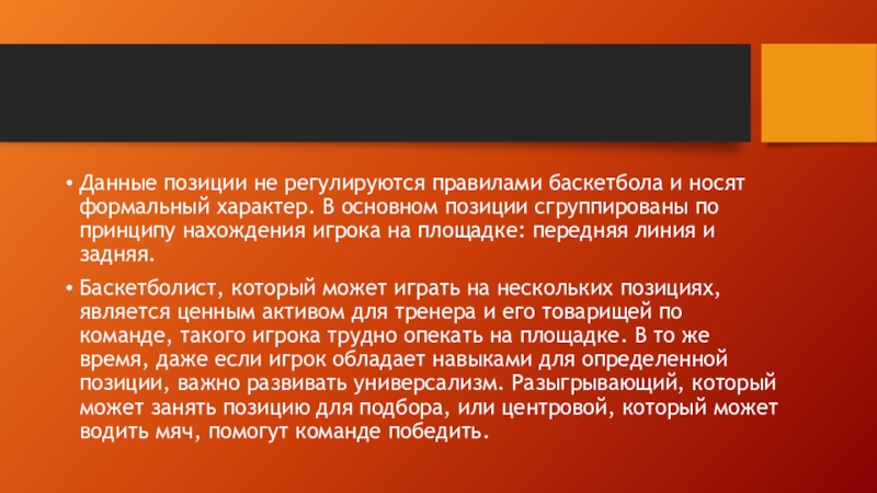 Слайд 14Данные позиции не регулируются правилами баскетбола и носят формальный характер. В
